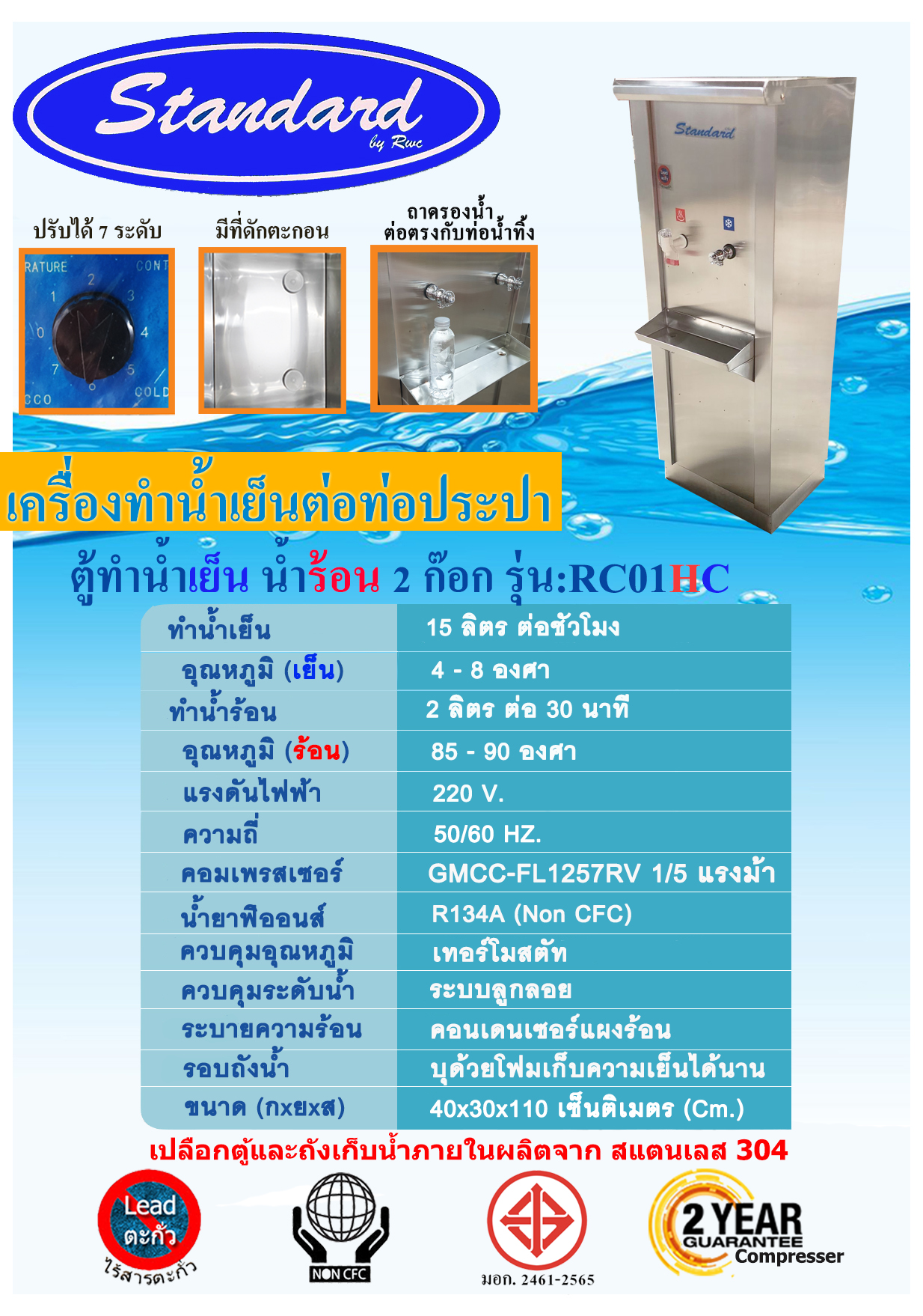 | ชื่อสินค้า | ตู้ทำน้ำเย็น น้ำร้อน สแตนเลส 2 ก๊อก ต่อท่อน้ำประปา (RC01HC) |